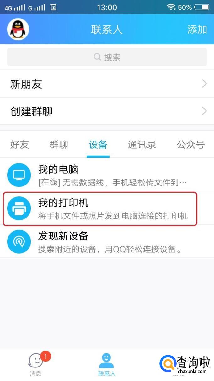 此时,我们发现在手机QQ的设备栏里面,多了“我的打印机”选项(第一次使用时,直接登录QQ是找不到该选项的),点击一下。