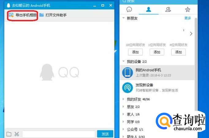 点击“联系人”里面的“我的设备”下面的我的安卓手机,弹出对话框,点击对话框中的“导出手机相册”。