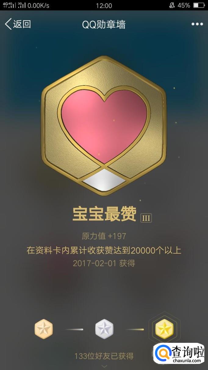 “宝宝最赞”则与点赞有关,收到的赞达到200个就可以获得初级勋章,到达2000个就是银勋章,20000个赞就是金勋章哦!两万个赞可以说是很难得的哟!