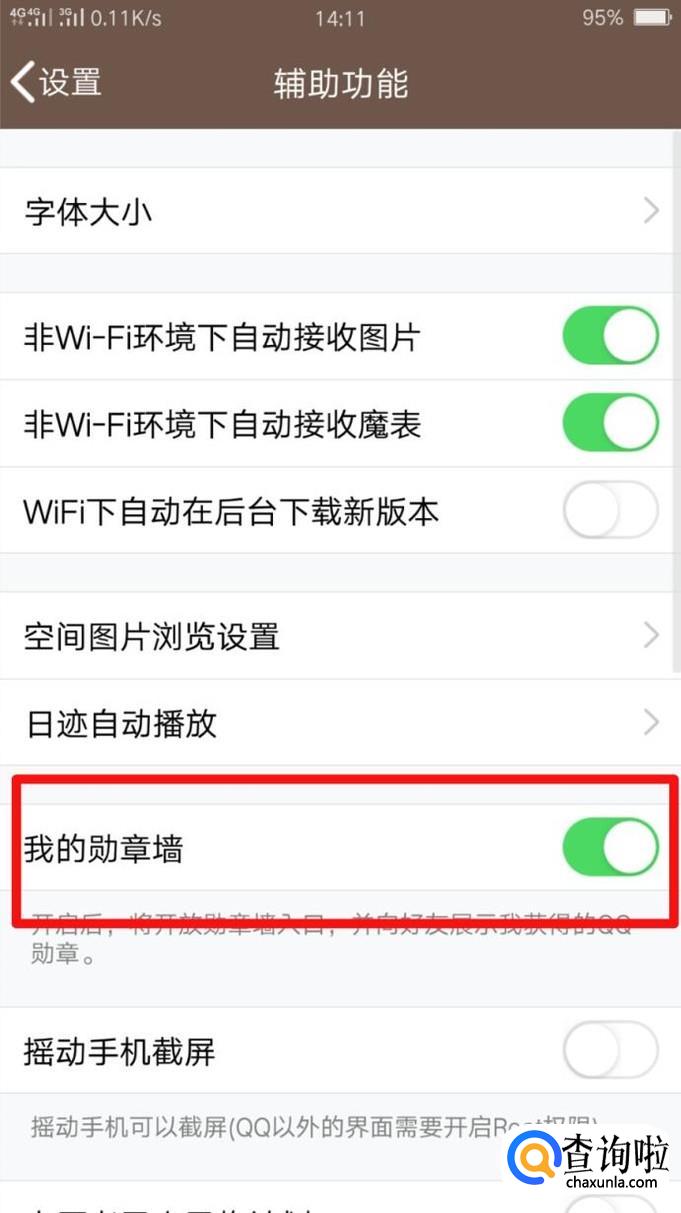 大家要注意一点,有的人可能发现自己没有QQ勋章墙的入口,这其实与自己的设置有关,在设置——辅助功能——我的勋章墙中,开启之后,才有QQ勋章墙的入口哦,如果发现没有入口,小编建议大家去查看是否开启了我的勋章墙。