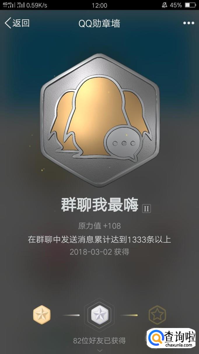 “群聊我最嗨”是通过在群里聊天可以获得的勋章,初级铜勋章只需要在群里聊天达到333条信息就行了;银勋章需要在群里发送的信息达到1333条;而最最难获得的金勋章需要3333条以上哦!