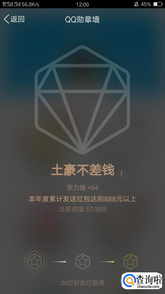 “土豪不差钱”的勋章自然是关于发红的,本年发红包金额达到888元就可以“获得土豪不差钱”的铜勋章;达到2888元是银勋章,红包金额达到8888元就可以获得金勋章了,但是要注意哦,这个金额只算本年的,第二年会重新累积计算。
