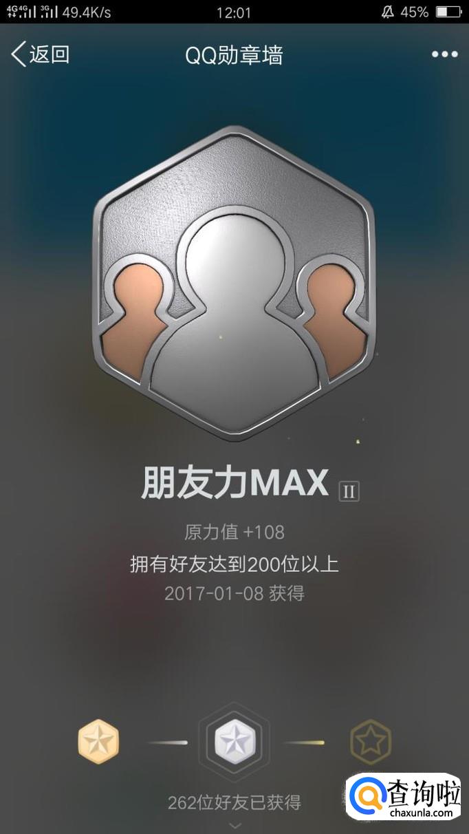 “朋友力MAX”:好友列表中QQ好友达到50位,就是获得该铜勋章的条件,拥有的好友达到200位,银勋章就可以获得了,是不是很简单呢?如果你的QQ好友多达600级600以上,那么恭喜你,金勋章就可以得到了哦!(小编至今还没有600为好友)