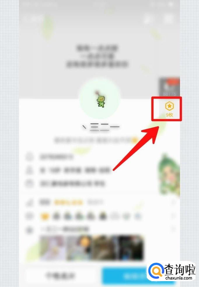 在个人资料界面就有QQ勋章墙的入口,在头像的右边,点赞的下方,小编框起来了,也就是箭头所指,如下图所示哦。