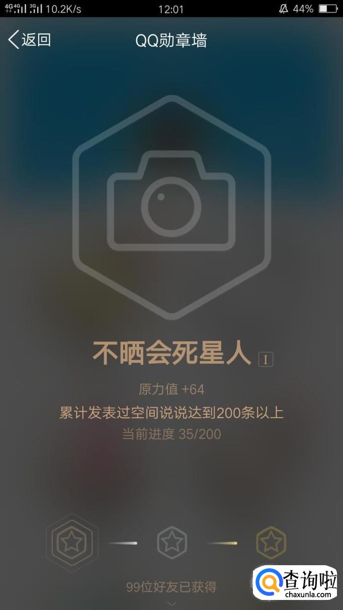 最后一个为“不晒会死星人”,要积极发说说哦!空间说说达200条为铜、达500条为银、达1000就可以获得金勋章啦!