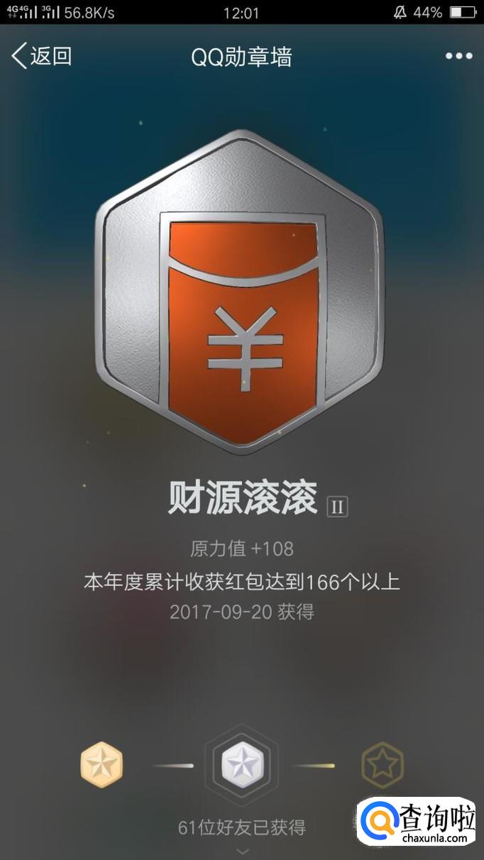 “财源滚滚”肯定收获的红包啦,这个与“土豪不差钱”一样,也只算本年的哦!但是这与金额没关系了,与红包个数相关,收获66个红包获得铜勋章;如果获得166个红包为银勋章;累计收获的红包达到666个就是金勋章了,朋友们,加油抢红包去吧!