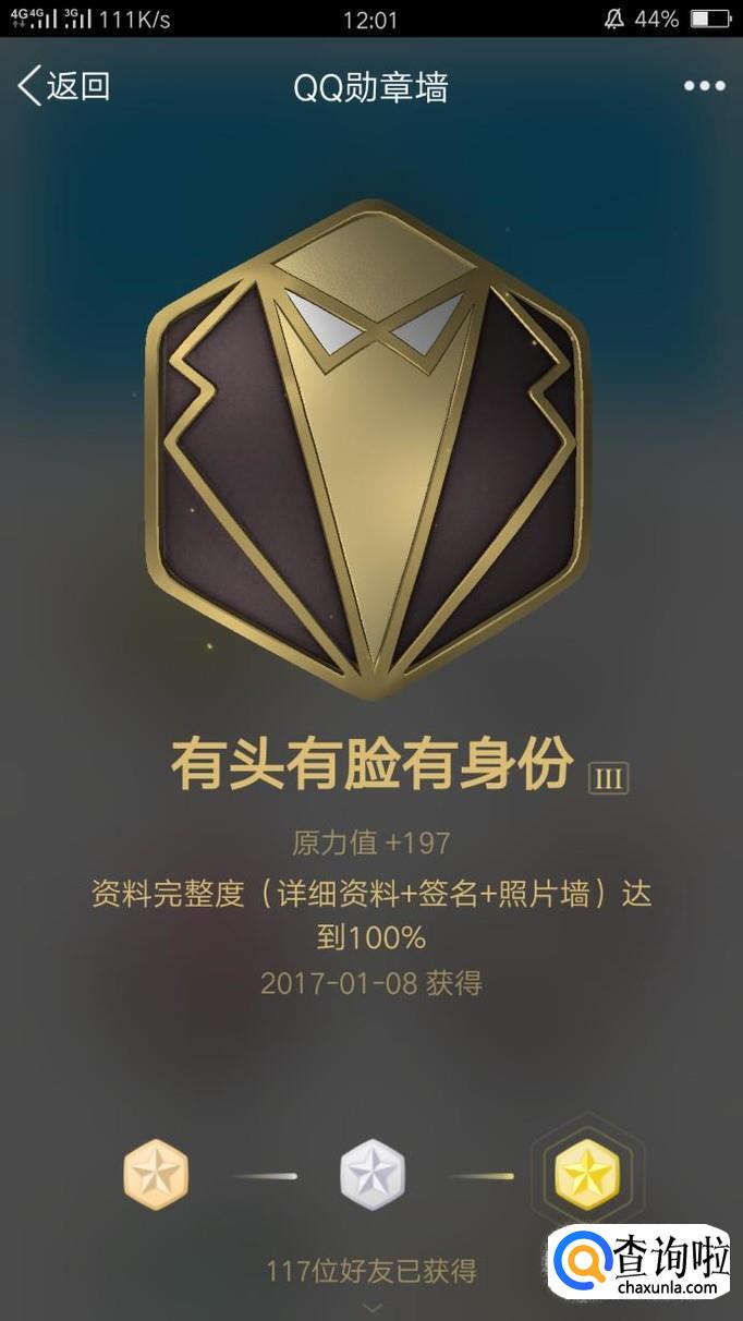 “有头有脸有身份”,这与个人资料的完整度有关,资料完整度包括详细资料、签名和照片墙,达到40%就是铜勋章,达到70%就是银勋章,100%自然是金勋章啦!