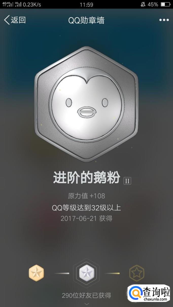 第二个勋章叫做“进阶的鹅粉”,QQ等级达到8级以上就可以获得初级铜勋章,达到32级就可以获得银勋章,金勋章要达到64级哟!