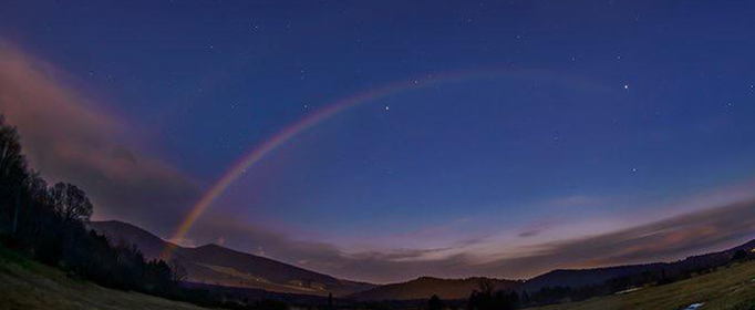 提到月虹,你一定猜到和月亮有关了。是的,月虹是在月光下出现的彩虹,又叫黑夜彩虹、黑虹。但由于月光亮度较小,月虹通常较为朦胧,因此最好的观测时机是满月附近月光最明亮的几天。月虹通常出现于月亮反方向的天空,如果是在日落后,月亮在东方,月虹就会出现在西方;如果是日出前,月亮在西方,月虹就会出现在东方。