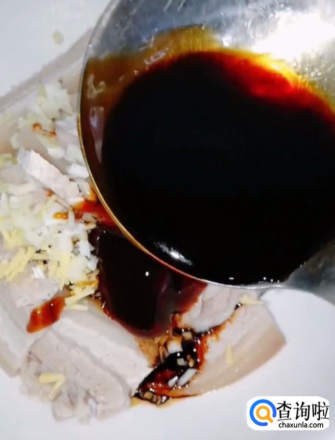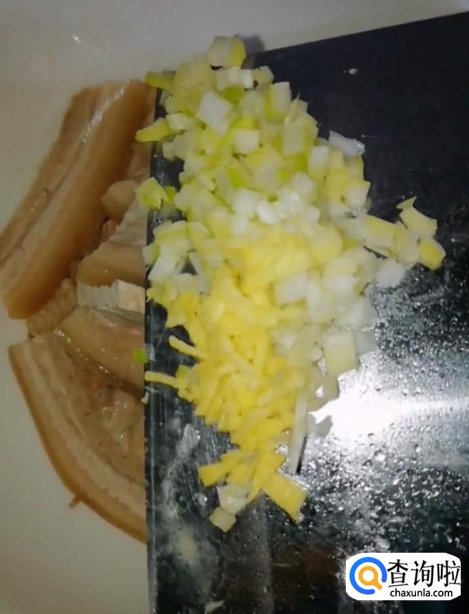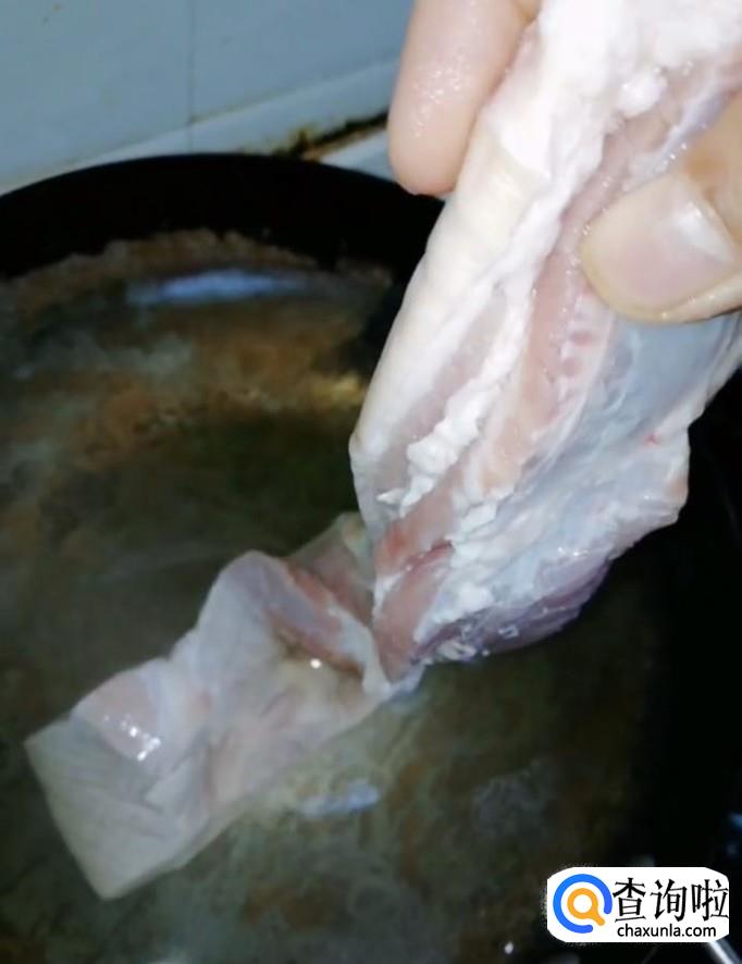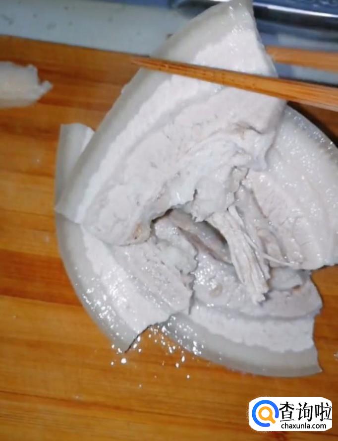 然后我们将煮好的五花肉取出来,用刀切成厚片
