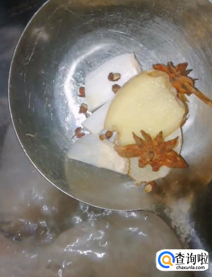 首先我们将买回来的五花肉放入冷水锅中,开锅撇去浮沫,加入葱姜,花椒,大料,料酒,盐,小火煮20分钟