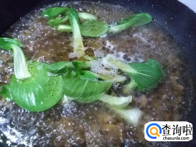 锅中的汤烧开后,将青菜放入锅中,倒入煮好的面条搅匀