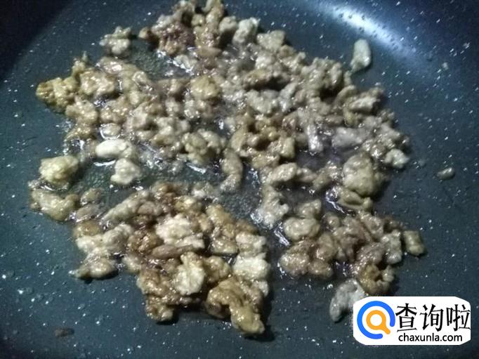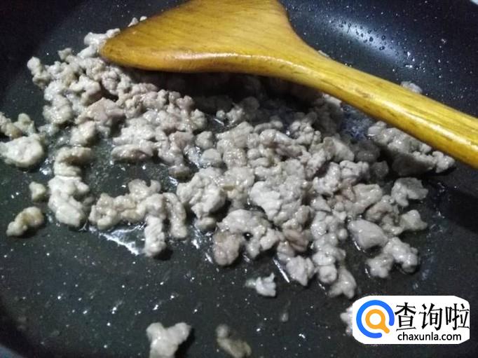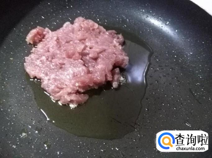 锅烧热,凉油将肉末下锅翻炒(凉油炒肉末不粘锅,且容易炒散)