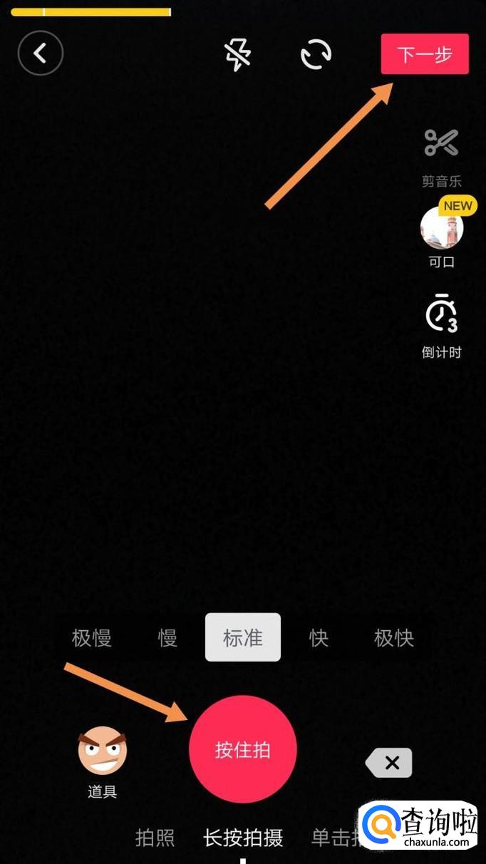 开拍后,下方会出现按住拍,就开始拍摄了,拍摄完成后,在右上方点击下一步,如下图。