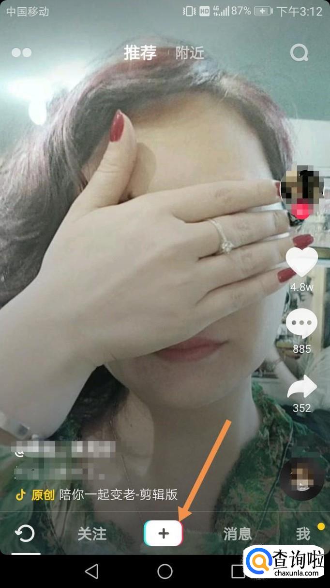 首先打开抖音短视频APP,点击中间的“+”号,如下图。