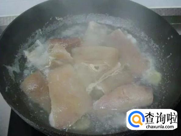 肉皮用开水煮5分钟左右,拔毛、清理肉皮反面多余的肥肉。