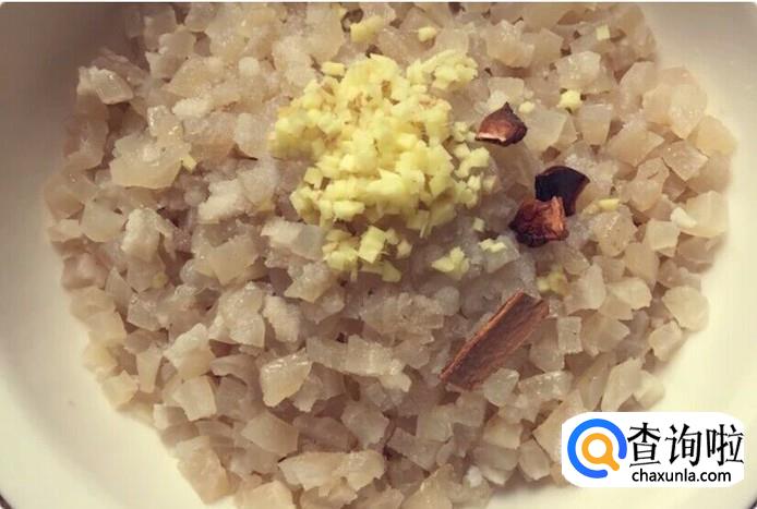 清理完肉皮以后,切成小丁,放入生姜末和少许八角桂皮。