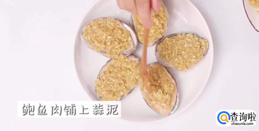 将搅拌好的蒜泥铺在鲍鱼肉上,尽量覆盖得饱满一点。