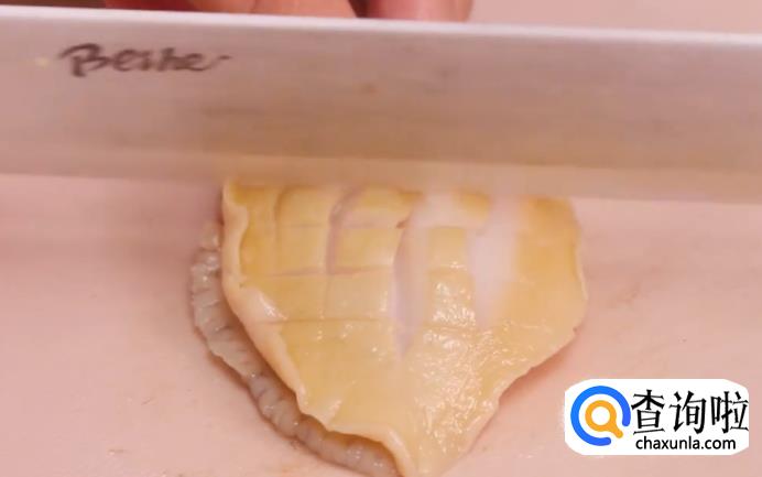 将鲍鱼肉用切芒果的方法划开,这样会更容易入味一点。