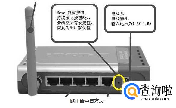 还可以使用路由器上的复位键进行路由器重置。在其背面有重置按钮,长按一会儿,待路由器重启之后,等到恢复出厂设置完成,然后使用默认的用户信息进行登陆操作即可。