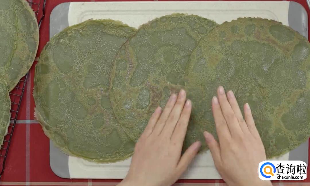 包毛巾卷:将煎好的薄饼好看的那一面放在下面,三个叠放在一起;在薄饼上涂上一层奶油,放上蜜红豆;然后慢慢的将薄饼裹起来,裹成一个毛巾卷样式。