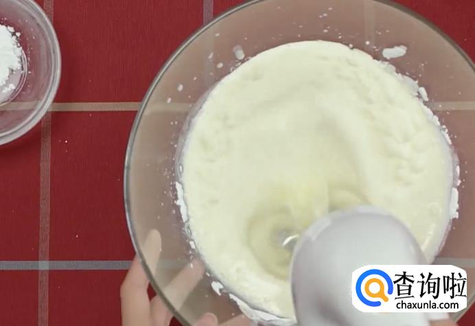 打奶油:在碗中倒入淡奶油400克,糖粉50克,用打蛋器将奶油打发备用。