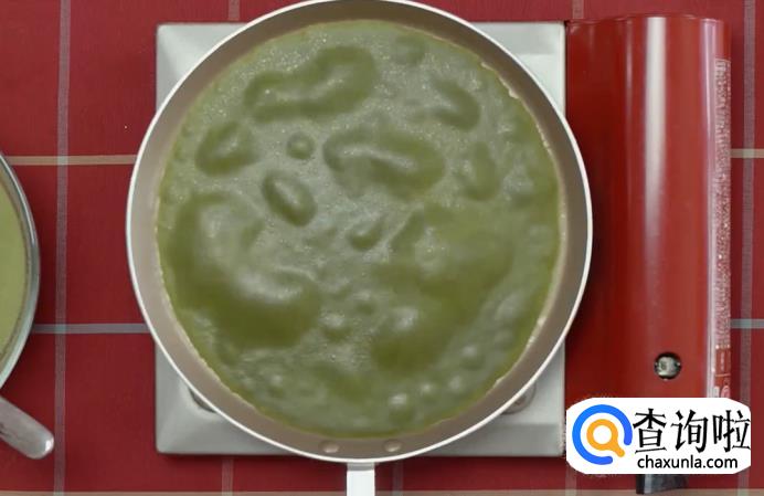将适量蛋液倒入平底锅中,用小火摊成薄饼。