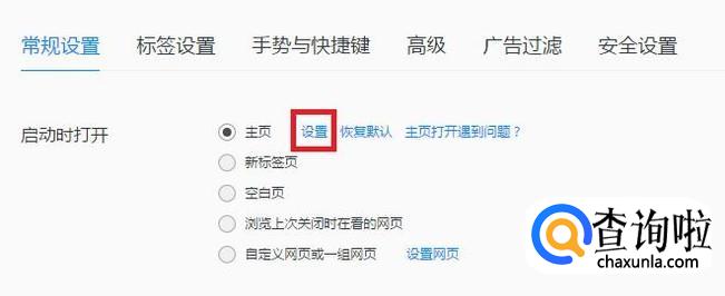 在常规设置的启动时打开一栏中,点击主页后面的“设置”选项。