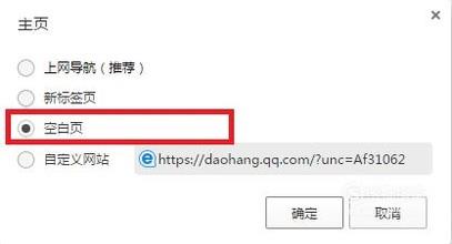 在主页设置中,选择“空白页”选项或在自定义网站中输入自己想要默认打开的网站后,点击确定,即可成功消除“上网导航”。