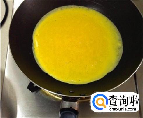 平底锅刷洗干净,烧热关火,用勺子舀一勺子蛋液放进去,轻轻摇晃让其扩大,打开小火慢慢煎。
