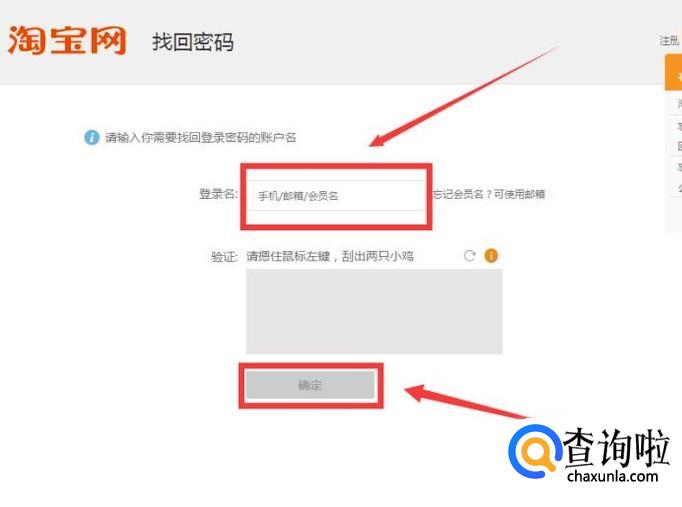 根据页面提示输入自己的淘宝账号注册时使用的“会员名”或“手机号”或“邮箱”(任选一个即可),摁住鼠标左键,刮出两只小鸡验证,最后点击确认。