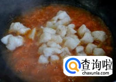 熬好番茄酱后我们向锅中加入我们腌好的龙利鱼,中火煮。