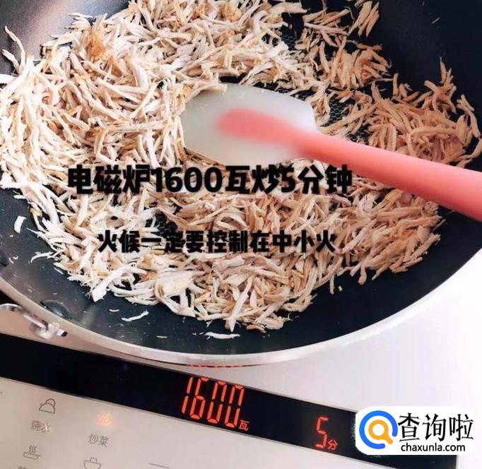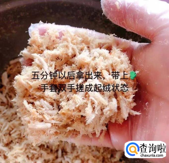 五分钟后拿出肉丝戴上手套继续搓成绒,如下图所示。小贴士:1.重复炒和搓的动作三次;2.搓肉丝的时候,必须带上手套这样才更加卫生。