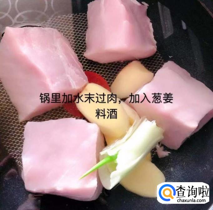 首先把里脊肉切成块放入锅中,加入适量的水和葱姜料酒煮五分钟,如下图所示。