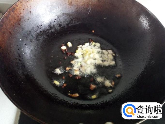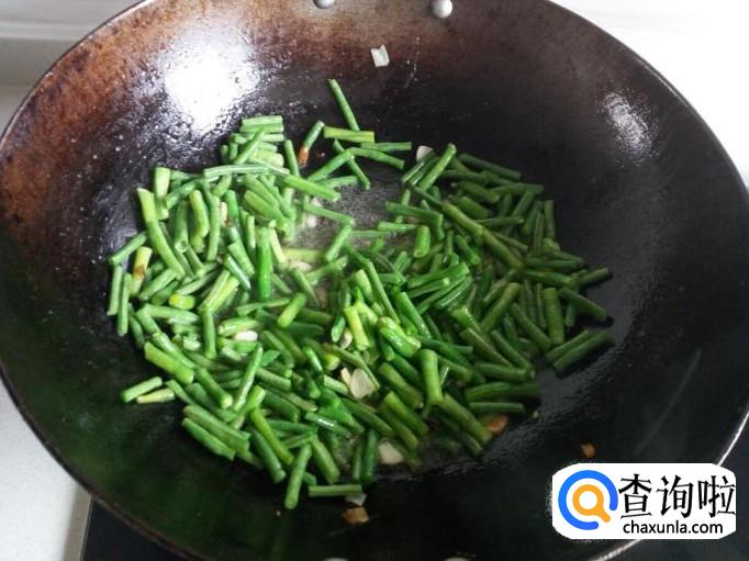 锅内放入油加热,油热后放入花椒,葱,姜,蒜,爆锅。放入豇豆翻炒,放少许料酒,盐。