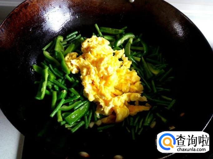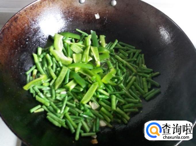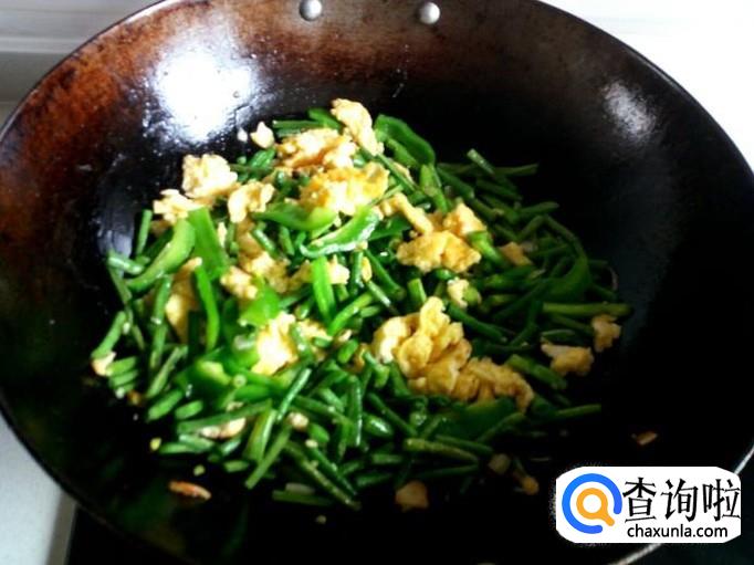 炒至豇豆断生,放入青椒略翻炒一下,然后放入炒好的鸡蛋。