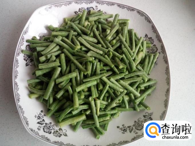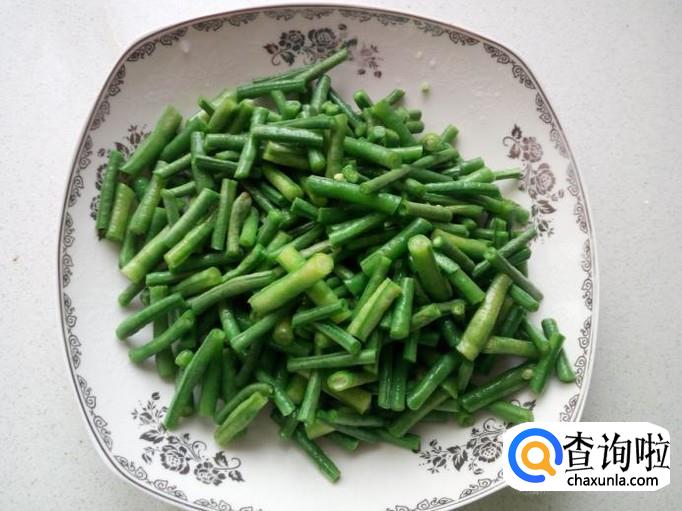 豇豆用开水汆一下,入锅几秒钟即捞出,迅速用冷水过凉,沥干水分,备用。