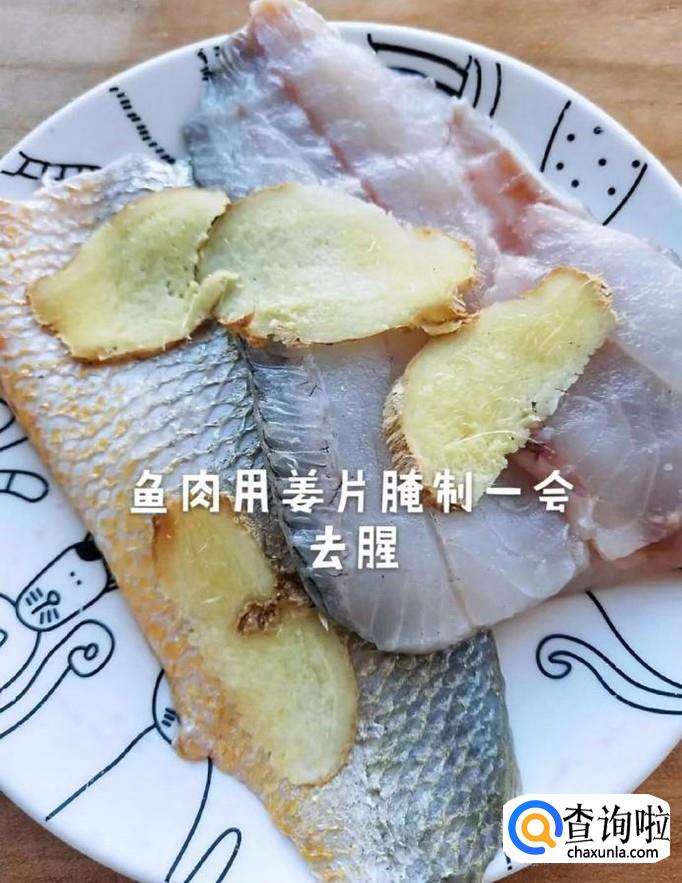 首先将买回来的鱼去骨去刺,用姜片腌制15分钟,如下图所示。