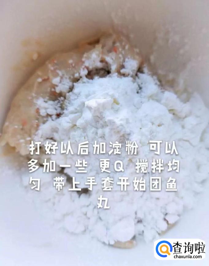 接着在打好的鱼肉泥中加入适量的淀粉,搅拌均匀,带上手套团成圆子,如下图所示。小贴士:加入淀粉是为了保证做出来的鱼丸更加Q弹。