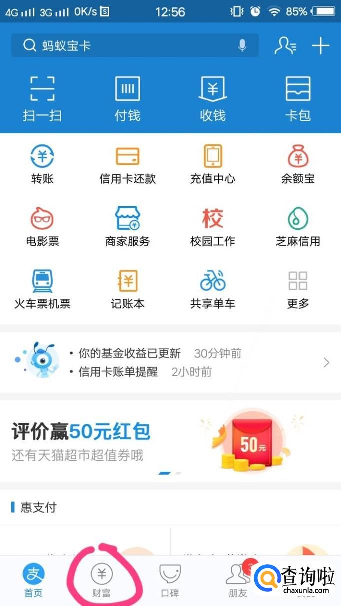 打开支付宝,点击“财富”。