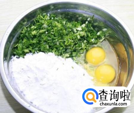 将鸡蛋打入碗中,面粉也放入碗中,兑上适量的凉白开水,再把韭菜和适量的盐放入碗中,一起搅拌成糊状,