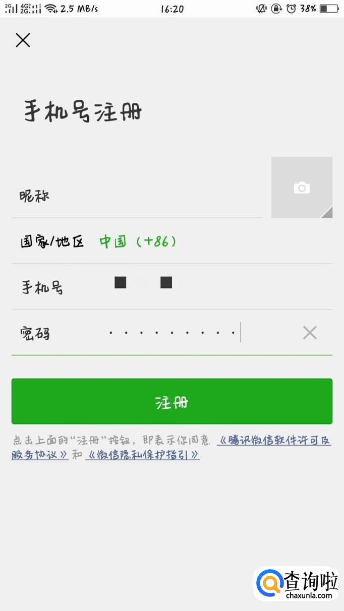 微信需要用手机号注册,填写好手机号、密码和昵称,选择好头像后,点击“注册”。