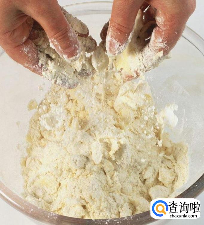 先往碗里放入适量的面粉,加入一些泡打粉,然后稍微的混匀后,再加入适量的黄油,用手将碗里面的东西混匀。