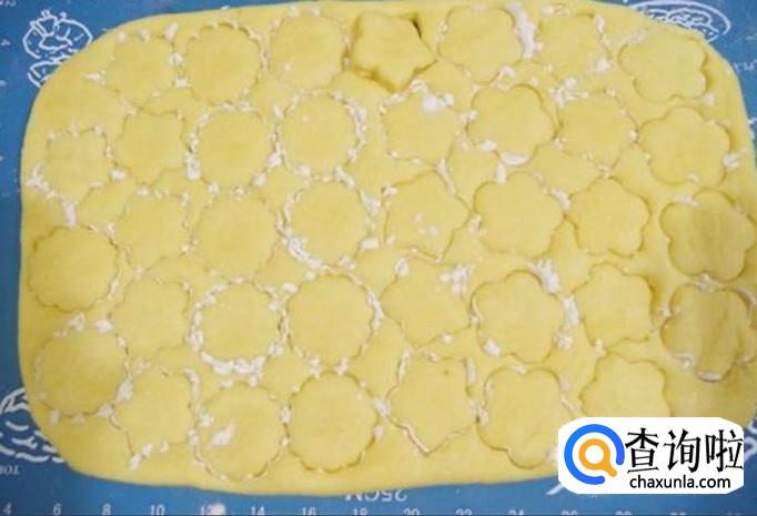 把冰好的面团拿出来以后,用擀面杖擀成一个面饼状,然后用司康饼的模具将面饼压出司康饼的样子出来。