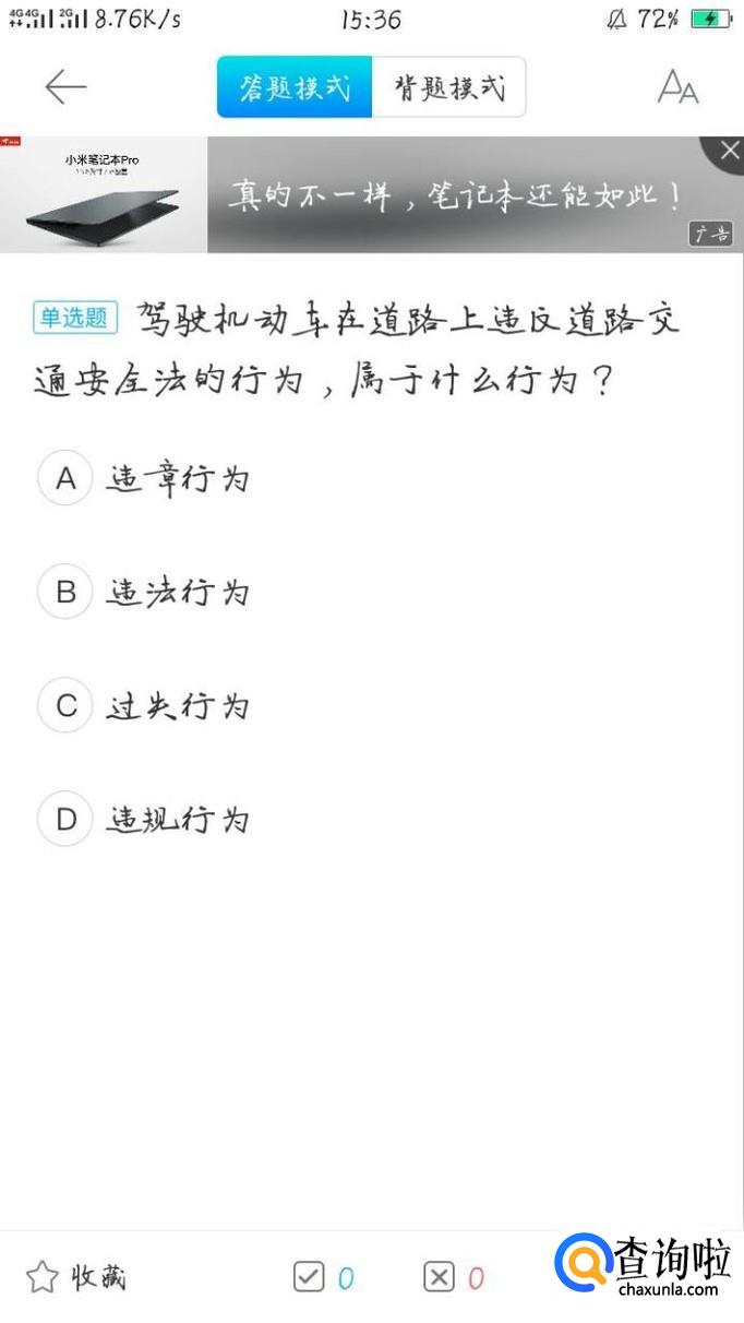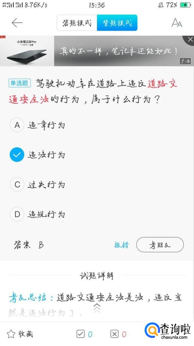 科一有1403道题。里面可以选择顺序练习,也可选择模拟考试,顺序练习就是把1403道科一题目按顺序做一遍。旁边还有背题模式,有选择的答案,和对这个选项的解释。
