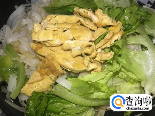 然后把炒熟的鸡蛋倒入锅中,把河粉、鸡蛋、豆芽,一起搅拌均匀,最后加入少许盐调味。