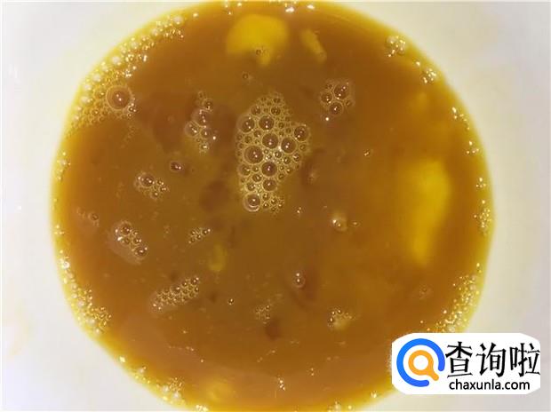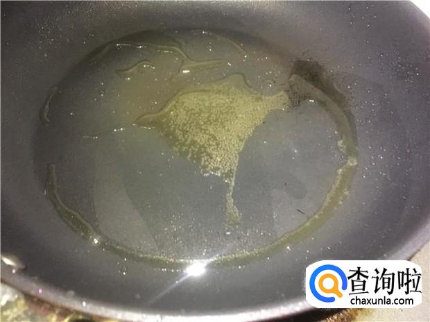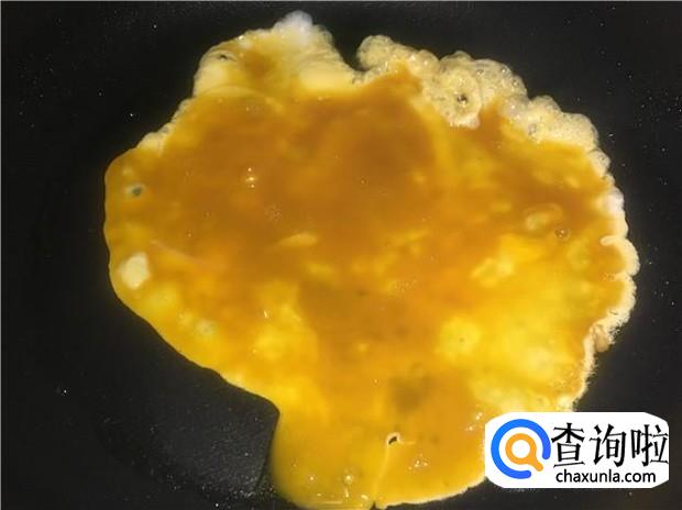 锅里放入少许花生油,倒入鸡蛋液,把鸡蛋炒熟,用锅铲弄碎。