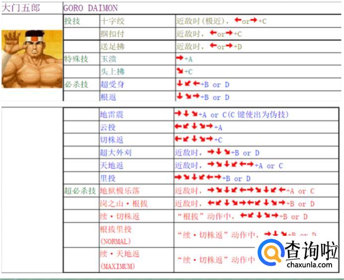 主角队出招表:草薙京、二阶堂红丸、大门五郎。