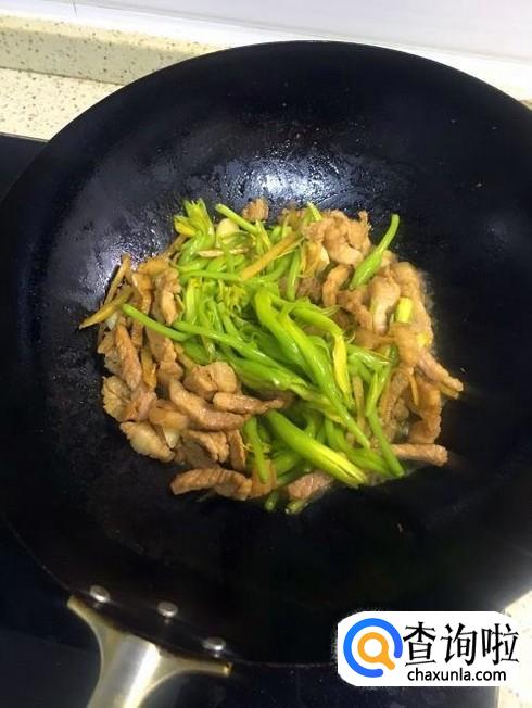 瘦猪肉切成丝,加上生抽、耗油和淀粉抓一抓腌制一下。锅里倒点油烧热,将肉丝放进去翻炒变色,加上葱姜末翻炒。