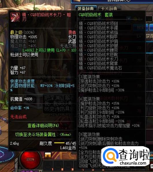 异界套装方面,作为当前版本中必不可少的BUFF换装装备,我们可以选择异界二期的“CQB初级战术”套装,凑齐6件套即可达到换装效果。